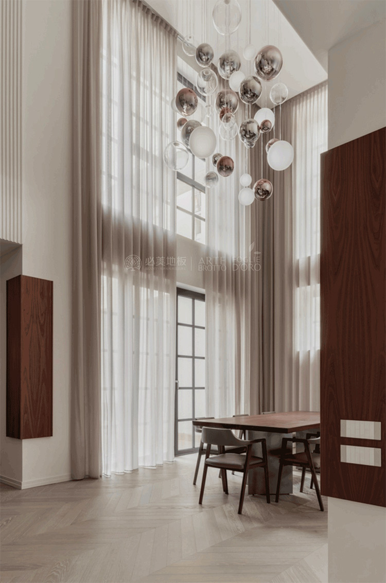原木色系地板大面積鋪裝這就是豪宅本宅,與整體木質墻面互相呼應,在自然和現代之間創造完美的視覺平衡感,不同空間配置的確在同一地板飾面找到自然共鳴,讓居者回歸大自然,感悟內心的純凈和生活的真諦。