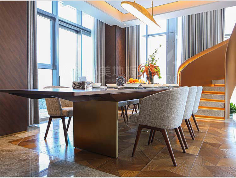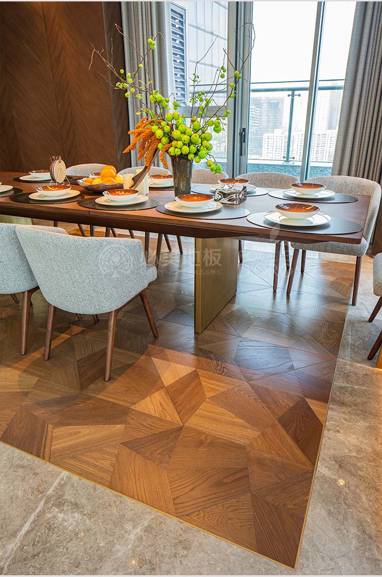 在餐廳區域地面鋪裝的選擇,是奠定整個空間氣質的關鍵。甄選了來自意大利必美菲列德羅Foglie d’Oro的弗拉門蒂拼花地板。