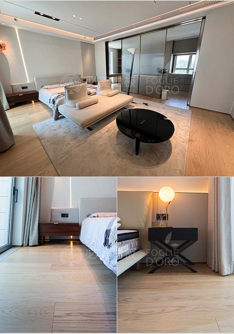 從旋轉樓梯的藝術焦點,到餐客廳弗拉門蒂拼花的幾何動態節奏;從茶室碧昂佳橡木的溫潤禪意,到次臥巴薩諾直板的寧靜舒適;從主臥巴塞吉奧橡木的尊貴沉穩,再到私人會所巴薩諾直板的活力溫吞……在這座深圳灣頂奢復式別墅中,每一塊必美地板都絕非簡單的地面鋪裝,而是經過深思熟慮的空間靈魂塑造者。它們以不同的個性,共同譜寫出一曲關于自然、藝術、奢華與生活的和諧交響。